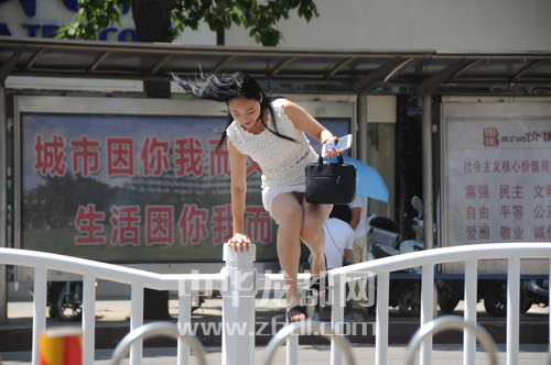 七一路上,一位妙齡少女不顧個人形象翻越護(hù)欄。