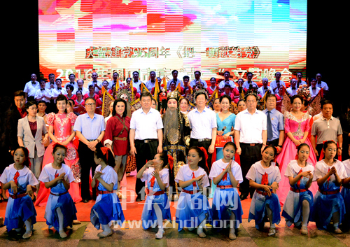 演出結(jié)束后,徐光等市領(lǐng)導(dǎo)與演職人員合影留念。 記者 沈湛 攝
