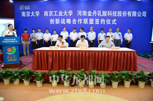 ????本報(bào)訊(記者 李莉) 7月9日上午,南京大學(xué)、南京工業(yè)大學(xué)、河南金丹乳酸科技股份有限公司創(chuàng)新戰(zhàn)略合作聯(lián)盟簽約儀式在鄭州舉行。副省長(zhǎng)張維寧,中國(guó)工程院院士張全興,南京大學(xué)副校長(zhǎng)談?wù)苊?,南京工業(yè)大學(xué)副校長(zhǎng)喬旭,省科技廳廳長(zhǎng)張震宇,市委書(shū)記、市人大常委會(huì)主任徐光,省環(huán)保廳副廳長(zhǎng)師偉,市委常委、常務(wù)副市長(zhǎng)劉保倉(cāng),市委常委、組織部長(zhǎng)靳磊,副市長(zhǎng)王田業(yè),及鄲城縣主要領(lǐng)導(dǎo)、河南金丹乳酸公司主要負(fù)責(zé)人出席簽約儀式。