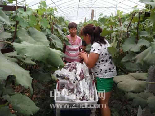 ????在農(nóng)場(chǎng)的葡萄大棚里,一串串葡萄被套上了塑料袋,形成了五顏六色的奇特景觀,社員正忙著采摘裝箱(如圖)。農(nóng)場(chǎng)技術(shù)人員介紹:“給葡萄套袋,可以明顯改善果實(shí)品質(zhì),保護(hù)果實(shí)不受病蟲害侵襲,減少農(nóng)藥殘留,防鳥啄食,改善果實(shí)外觀,提高果品檔次,是當(dāng)前生產(chǎn)高品質(zhì)、無公害葡萄的有效措施?!?/p>