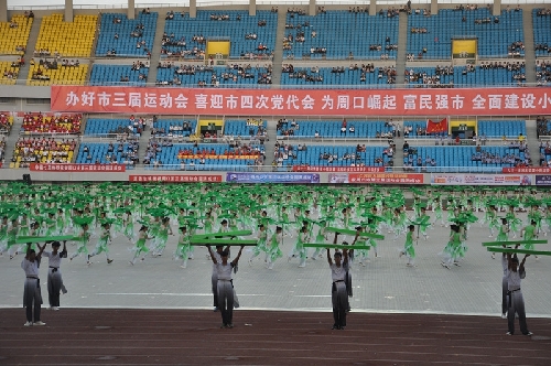 ????大型體育展示表演開始了,《印象周口》氣勢磅礴,來自周口幼兒師范學校和周口科技職業(yè)學院、沈丘縣教體局等單位的演員們披著鮮明的旗幟,激情奔跑在寬闊的體育場上,迎風飄揚的旗幟讓整個會場變成了藍色海洋;周口職業(yè)技術學院衛(wèi)生學院與周口文昌中學的朗誦表演《荷韻悠長》吟誦豪邁,響徹會場;周口市自行車協(xié)會聯(lián)合川匯區(qū)、淮陽縣、太康縣等多個教體育一起表演的《崛起之路》更是體現(xiàn)了周口正在實現(xiàn)中國夢的征途上迅速崛起,書寫著新的精彩篇章……