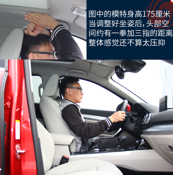 體驗者身高175厘米,前排座椅降到最低的時候頭部還有比較充足的余量,完全不會感覺到壓抑;不過后排頭部就不太行了,頭部距離車頂非常接近,要是身高再高一些的乘客坐進后排,已經(jīng)基本上快頂?shù)筋^了。儲物空間中規(guī)中矩,基本上沒有太多讓人驚喜的地方。扶手箱的空間不小,高度也合適,可以放些雜物。