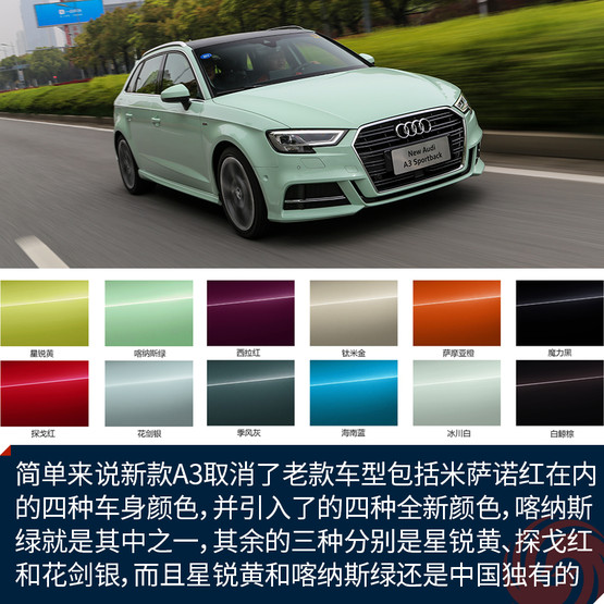 先來說說喀納斯綠到底是什么顏色吧。簡單來說新款A3取消了老款車型包括米薩諾紅在內(nèi)的四種車身顏色,并引入了的四種全新顏色,喀納斯綠就是其中之一,其余的三種分別是星銳黃、探戈紅和花劍銀,而且星銳黃和喀納斯綠還是兩種中國市場獨有的顏色。如果說這個顏色看上去像什么,我覺得大概像是哈密瓜冰激凌,或者是綠色的奶油,反正給我一種清新又甜蜜的錯覺。