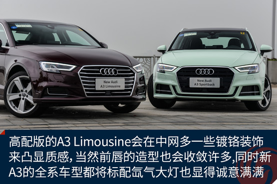 新顏色的加入讓原本青春靚麗的A3變得更加鮮嫩,雖說這樣的顏色不一定適合所有人,但是至少我是很喜歡的,應該不少女生也會心生好感。而外觀的改進進一步增加了A3的活力,棱角更加鮮明的大嘴,首次出現(xiàn)在A3上的LED矩陣大燈,以及外擴的前唇都讓這臺擁有S-Line套件的A3 Sportback攻擊性十足,同時全系都將標配氙氣大燈也是誠意滿滿。而高配置的A3 Limousine會在中網(wǎng)多一些鍍鉻裝飾來凸顯質(zhì)感,當然前唇的造型也會收斂許多。