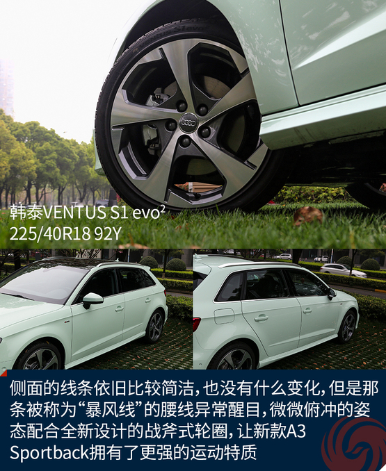 側(cè)面的線條依舊比較簡潔,也沒有什么變化,但是那條被稱為“暴風線”的腰線異常醒目,微微俯沖的姿態(tài)配合全新設(shè)計的戰(zhàn)斧式輪圈,讓新款A3 Sportback擁有了更強的運動特質(zhì)。