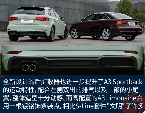 全新設(shè)計的后擴散器也進一步提升了A3 Sportback的運動特性,配合左側(cè)雙出的排氣以及上部的小尾翼,整體造型十分動感。而高配置的A3 Limousine會用一根鍍鉻飾條裝點,相比S-Line套件“文明”了許多。與LED矩陣大燈相呼應的是全LED尾燈,兩者相輔相成為新車帶來了更強的攻擊性以及橫向視覺延展性,新加入的流動式轉(zhuǎn)向燈在美觀的同時也提升了整車的科技感。