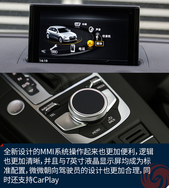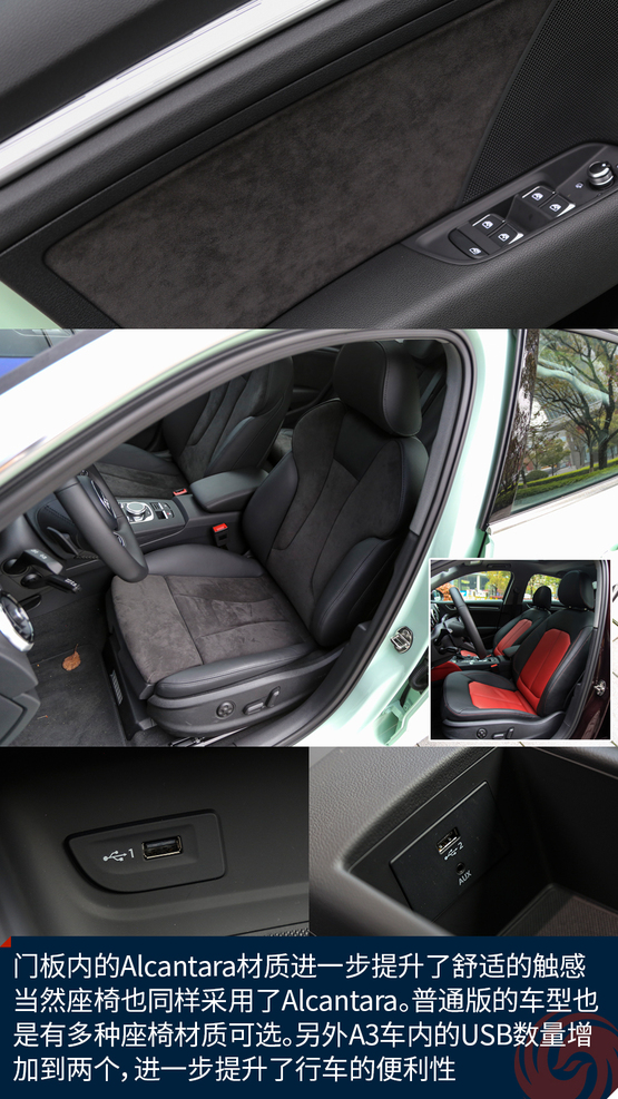相比較外觀的改變,內(nèi)飾的變化就要少了一些,最直觀的變化莫過于全新設(shè)計的真皮方向盤,不僅好看也十分的好用,發(fā)光的迎賓踏板進一步增加了車輛的高級感,中控面板上的鋁合金材質(zhì)的裝飾條質(zhì)感出色,不僅如此,還有多種樣式和材質(zhì)可選;而門板內(nèi)的Alcantara材質(zhì)進一步提升了舒適的觸感,當然座椅也同樣采用了Alcantara。另外新增加的USB接口也進一步增加了行車的便利性,這也讓A3車內(nèi)的USB數(shù)量增加到兩個。同時,全新設(shè)計的MMI系統(tǒng)操作起來也更加便利,邏輯也更加清晰,并且與7英寸液晶顯示屏均成為標準配置,微微朝向駕駛員的設(shè)計也更加合理,同時還支持CarPlay。