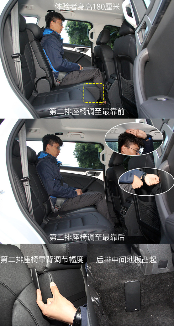關(guān)于第二排,最重要的當(dāng)然要數(shù)空間了。剛一坐到第二排之后,感覺確實(shí)是很寬敞,不僅腿部空間毫無壓力,頭部空間也完全沒有壓抑感,而且,第二排座椅還支持四向調(diào)節(jié),即座椅前后調(diào)節(jié)和靠背角度調(diào)節(jié),在第三排沒人乘坐的情況下,第二排乘客基本可以找到N種舒服姿勢來應(yīng)對(duì)長途乘坐。只不過,第二排的中間地板凸起較高,一定程度上影響了中間乘客乘坐的舒適度。