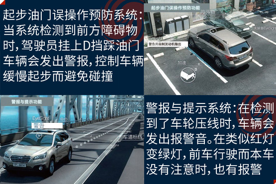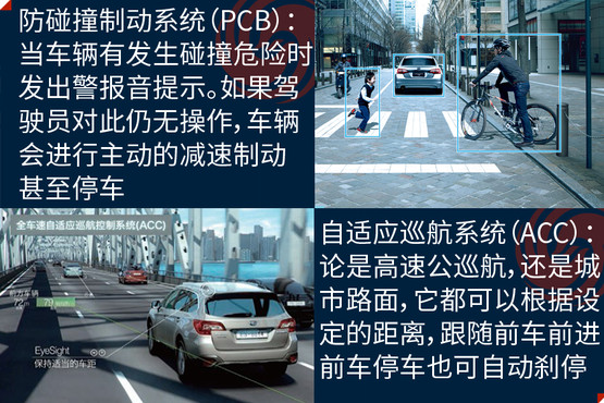 EyeSight駕駛輔助系統(tǒng)是避免事故發(fā)生,此次在中國市場亮相是它的第三代產(chǎn)品,其主要亮點(diǎn)是通過兩個(gè)模擬人眼的立體攝像頭,來監(jiān)控距離車輛前方100米以內(nèi),高度在1米以上的人、車輛和物體,以減少傷害為目的的駕駛輔助系統(tǒng);除了距離以外,還可以對方向、高度大小等指標(biāo)進(jìn)行識別。它的主要功能分為四大類,分別是防碰撞制動(dòng)系統(tǒng)(PCB)、車速自適應(yīng)巡航控制系統(tǒng)(ACC)、起步油門誤操作預(yù)防系統(tǒng)和警報(bào)與提示系統(tǒng)。