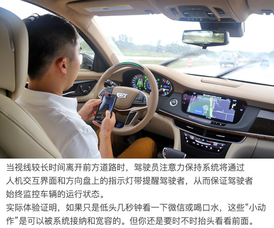 ????????原則上駕駛員應(yīng)該緊盯前方,時刻準(zhǔn)備著接管汽車的控制權(quán)。但實際上基于ACC自適應(yīng)巡航系統(tǒng)的Super Cruise?超級巡航為行駛中的汽車提供了充足的“安全緩沖余量”。在底特律郊區(qū)高速公路上實際體驗證明,視線短暫的離開正前方(大約3-5秒之內(nèi))處于系統(tǒng)安全的“可接受”范圍內(nèi),比如喝水、吃東西或者調(diào)節(jié)空調(diào)多媒體娛樂系統(tǒng),這些操作都沒什么問題。