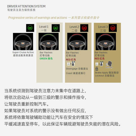 ????????若這個級別的警示還不能“喚醒”駕駛者,超級巡航系統(tǒng)將自動開啟雙閃、利用車輛輔助駕駛系統(tǒng)控制汽車逐漸減速并在路邊停車,然后OnStar安吉星工作人員將會通過遠(yuǎn)程對話介入以防止駕駛者因為“失能”造成更多不可預(yù)知的危險。