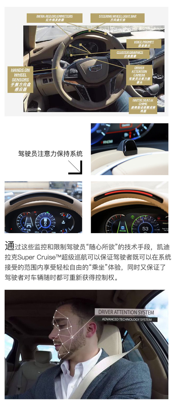 ????????但問題是,當(dāng)一臺車自己好好的行駛在高速公路上,人性驅(qū)使下的駕駛員很容易把注意力轉(zhuǎn)移到其它地方,這就造成了極大的安全隱患。所以凱迪拉克Super Cruise?超級巡航系統(tǒng)最與眾不同的地方,也是讓我覺得最有價推廣價值的設(shè)計理念,是通過駕駛員注意力保持系統(tǒng)與高精度地圖數(shù)據(jù)緊密結(jié)合?,主動監(jiān)測駕駛員的狀態(tài)并做出及時回應(yīng)。這套系統(tǒng)能督促駕駛者始終保持對車輛運行狀態(tài)的有效監(jiān)控,這給其釋放雙手的駕駛輔助功能帶來更安全、更自信的使用體驗。