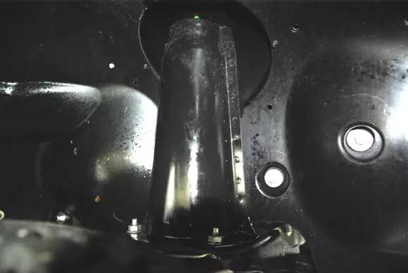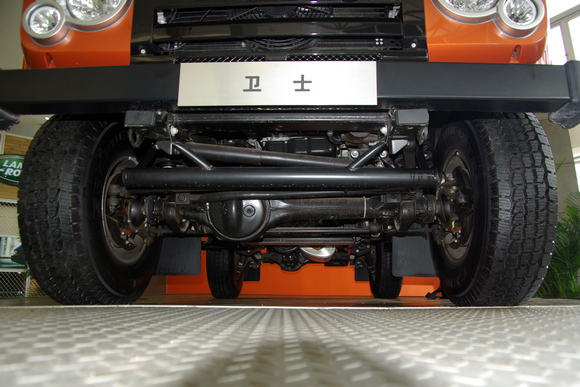 ????衛(wèi)士的底盤前視,衛(wèi)士作為一款硬派越野車,最小離地間隙達(dá)到了323mm(從圖上可以看到這一最小間隙位于前軸的差速器鼓包處),320mm的最小離地間隙意味著什么?一個人平躺在地面上,衛(wèi)士能從上方駛過而人不會有任何損傷。相比于一般SUV的200mm左右的最小離地間隙,衛(wèi)士顯然不在一個層級上。
