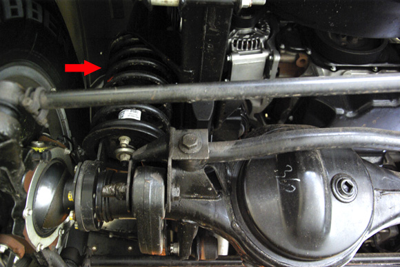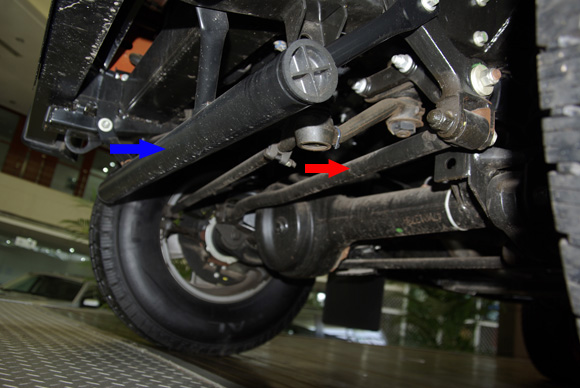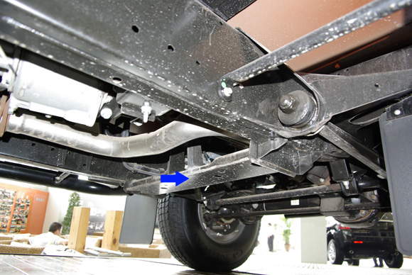 ????后軸特寫圖二,藍(lán)色箭頭所指為拖臂,紅色箭頭所指為后防傾桿,對于衛(wèi)士的車重而已,其粗細(xì)不能提供很好的仿側(cè)傾效果。后軸依然采用螺旋彈簧作為彈性元件。