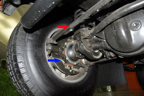 ????上圖為前軸轉(zhuǎn)向系統(tǒng)特寫,紅色箭頭為轉(zhuǎn)向拉桿,它負(fù)責(zé)拉動前輪產(chǎn)生左右的轉(zhuǎn)向。衛(wèi)士的轉(zhuǎn)向機構(gòu)比較特別,其羊角與硬軸直接采用了球頭的連接方式(藍(lán)色箭頭所指),整個羊角包裹住球頭,可以產(chǎn)生任意方向的旋轉(zhuǎn),這比起傳統(tǒng)的靠上下轉(zhuǎn)點定位旋轉(zhuǎn)的前軸,前輪的傾角和束角能在更大的范圍內(nèi)活動。
