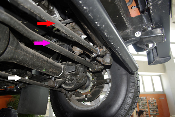 ????前軸特寫二,玫紅色箭頭為橫向推力桿,紅色為轉(zhuǎn)向拉桿,白色的拉桿連接左右的羊角,紅色的轉(zhuǎn)向拉桿帶動衛(wèi)士的右前輪轉(zhuǎn)向,通過白色的拉桿聯(lián)動左前輪,使左右前輪同步的進(jìn)行轉(zhuǎn)向。