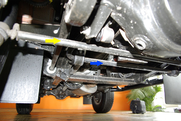 ????上圖中橙黃色箭頭為前軸的限位拉桿,不僅限制前軸自身發(fā)生扭轉(zhuǎn),也可對前軸的相對車架的前后位置進(jìn)行限制。藍(lán)色箭頭為前防傾桿,目測粗細(xì)并不算大,相信這也跟衛(wèi)士不看重公路性能有關(guān)。