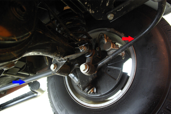 ????衛(wèi)士的后軸采用拖臂式后懸,紅色箭頭所指的拉桿就是拖臂。左右各一根,拖臂及避震機對后軸的自由度進(jìn)行控制,后軸相對車架的位置和自身的扭轉(zhuǎn)都得到了控制。