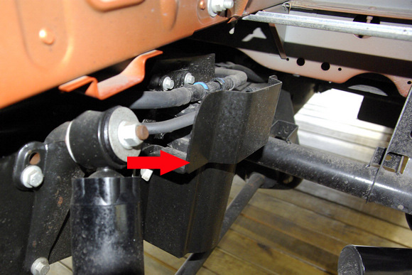 ????細(xì)節(jié)處,剎車的油管外側(cè)有護(hù)板(箭頭處)進(jìn)行周全保護(hù),有效杜絕越野時由車輪攪入的尖銳物體劃傷油管。