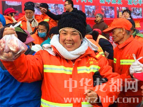 領到羊肉的環(huán)衛(wèi)阿姨很開心地微笑著。