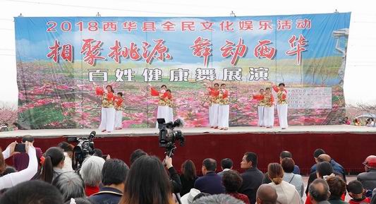 中華龍都網(wǎng)訊(周口報業(yè)全媒體記者 張猛)在西華縣第十四屆桃花節(jié)期間,由縣委宣傳部、縣文廣新局主辦的“相聚桃源 舞動西華”百姓健康舞展演活動,在黃橋鄉(xiāng)萬畝桃園舉行,來自全縣的10 余支舞蹈隊參加展演?;顒游姸嗍忻?、游客前來觀看。