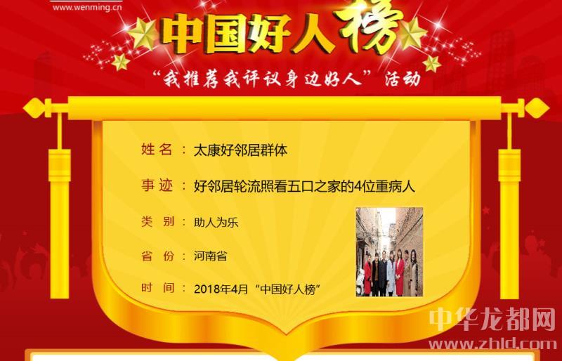 中華龍都網(wǎng)訊(周口報(bào)業(yè)全媒體記者 馬治衛(wèi))4月28日上午,4月中國好人榜發(fā)布儀式暨全國道德模范與身邊好人現(xiàn)場(chǎng)交流活動(dòng)在天津市和平區(qū)舉行。太康縣“好鄰居群體”榮登4月份中國好人榜。