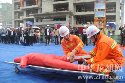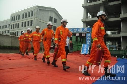 中華龍都網訊(周口報業(yè)全媒體記者 朱海龍)5月11日上午,在商水縣建業(yè)城項目施工工地,商水縣舉辦建筑施工現場應急救援演練,200多人冒雨觀摩現場演練。