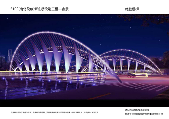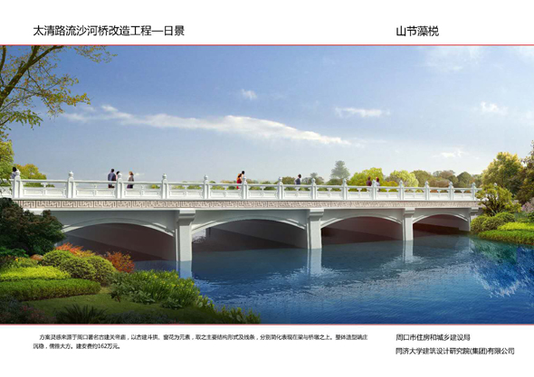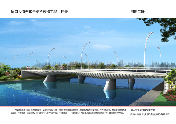 周口大道沙潁河橋景觀改造,設(shè)計(jì)造型簡單柔美,如行云流水,同時(shí)與沙潁河景觀帶相融合,給城市增添了生機(jī)與活力。周口大道賈東干渠橋以荷葉為設(shè)計(jì)元素,造型簡約而不失細(xì)節(jié)。周口大道流沙河橋造型簡潔大氣,線條流暢,像一條青龍游弋在水面上。文昌大道幸福河橋以花瓣、葉子為設(shè)計(jì)元素,造型豐富多彩。文昌大道流沙河故道橋在中分帶位置修建花壇,花壇造型莊重古樸,景石造型端莊沉穩(wěn)。太清路流沙河橋以古建斗拱、窗花為元素,造型儒雅大方。太清路洼沖溝2號橋以“輻轂相依”為名,既融合環(huán)境,又有團(tuán)結(jié)、合作的寓意。太清路賈魯河橋,增加了景觀造型,使人們可以重溫當(dāng)年賈魯河的美好畫卷。彭新莊橋以柳葉為元素,預(yù)示著留住賓客與送別親友的不舍之情的雙重含義。