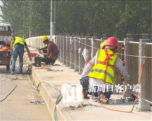 近日,記者在周口大道沙潁河大 橋施工現(xiàn)場(chǎng)看到,頂著37度高溫,施工人員正在進(jìn)行新欄桿的更換等工作。據(jù)工程施工方河南省大成建設(shè)工程有限公司項(xiàng)目商務(wù)經(jīng)理李寶胤介紹,大橋改造將在橋梁兩側(cè)各加寬九米,加上拱形鋼結(jié)構(gòu)造型?!澳壳耙巡鸪伺f欄桿,安裝上新的不銹鋼欄桿,在橋面人行道上鋪裝了石材,并對(duì)橋欄桿兩側(cè)及橋體兩側(cè)實(shí)施亮化工程,預(yù)計(jì)8月底前完工,而后再陸續(xù)進(jìn)行橋梁加寬工程?!?/p>