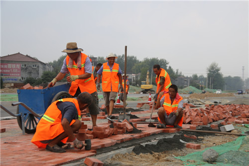 8月28日上午,記者在周項(xiàng)路武盛大道交叉口看到,工程車輛正在馬路南側(cè)人行道鋪設(shè)柏油路面,十幾名工人頂著烈日,在現(xiàn)場(chǎng)作業(yè)。周項(xiàng)路苑寨市場(chǎng)門前,施工人員正在向基坑內(nèi)打樁,施工人員告訴記者,由于周邊地質(zhì)屬于流沙段,容易塌方,因此需要使用LV拉森鋼板樁進(jìn)行加固。在李埠口鄉(xiāng)政府東側(cè),工人們正在鋪設(shè)地磚。周項(xiàng)路港區(qū)路段,隨處可見施工人員。