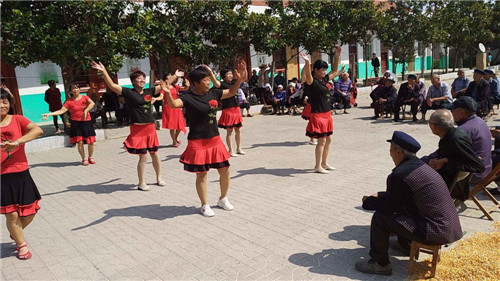 活動現(xiàn)場,隨著婉轉(zhuǎn)悠揚(yáng)的歌曲響起,統(tǒng)一服裝的舞蹈隊(duì)阿姨們翩翩起舞,老人們都搬著小板凳圍坐成一圈,氣氛一片祥和。