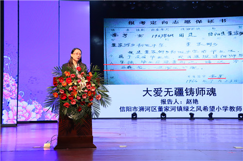 報告會上,李芳的同事綠之風(fēng)希望小學(xué)教師趙艷、李芳的老師信陽職業(yè)技術(shù)學(xué)院語言傳媒學(xué)院教師熊可書、李芳的女兒代雨辰和信陽市浉河區(qū)委宣傳部新聞中心記者劉亞迪分別以《大愛無疆鑄師魂》,《那是青春吐芳華》,《有媽媽的地方處處是溫暖》,《大別山上映山紅》為題,深情講述李芳同志一心想著學(xué)生,全身心投入教育工作,扎根鄉(xiāng)村獻身教育事業(yè)的點點滴滴,詮釋了李芳同志不忘初心、潛心育人、敬業(yè)奉獻、舍生忘我的高尚品德和優(yōu)秀品質(zhì),為與會者帶來了一場感人肺腑的報告會。