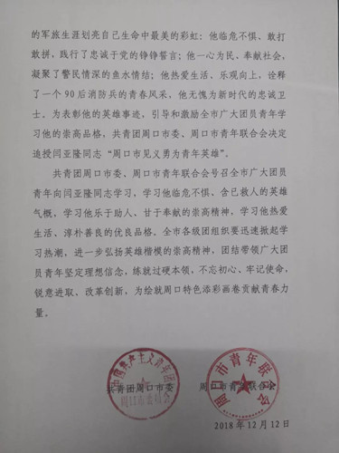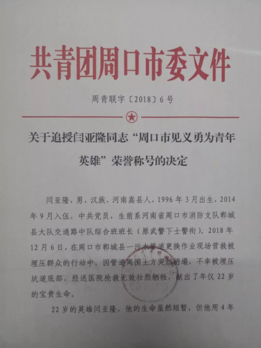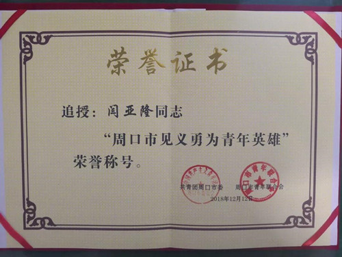 閆亞隆同志被追授“周口市見(jiàn)義勇為青年英雄”榮譽(yù)稱號(hào)