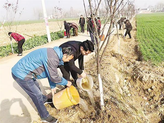 縣規(guī)劃辦李華兵帶領(lǐng)幫扶隊員在鄧城鎮(zhèn)路口村和村民共同種下致富之樹。 (莊正富 攝)