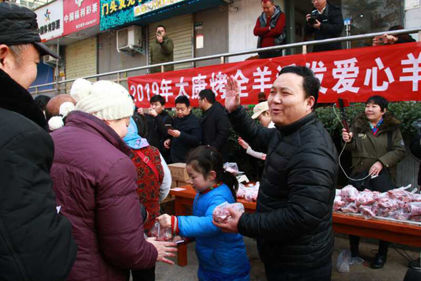 小小燒烤店門前,成了倡導(dǎo)“愛與奉獻(xiàn)主會(huì)場(chǎng)”。 2019年1月1日上午10點(diǎn),新年第一天,鄭州市國(guó)基路與豐慶路交叉口太康烤全羊店門口,60多名環(huán)衛(wèi)工、殘疾人、困難群眾等弱勢(shì)群體聚集在這里,排隊(duì)免費(fèi)領(lǐng)取“羊肉哥”孫合理和妻子劉曉愛派送的一份新年禮物——愛心羊肉,而這愛舉從2010年元旦開始到如今,已經(jīng)堅(jiān)持了9年。