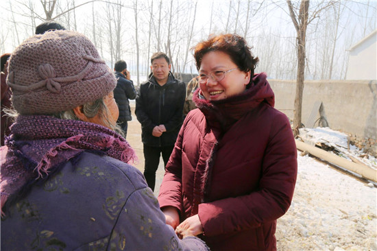 2018年5月11日,張穎波在看望大新鎮(zhèn)陳樓村的困難群眾吳鳳蓮時,曾對她說過一句話,“等你新房蓋好,我再來看你?!保罚稓q的吳鳳蓮把這句話牢牢地記在了心里。一見張穎波的面,拉著手留著淚連聲說:“俺家房早就蓋好了,就一直盼著恁來。我知道恁忙,可就想讓恁看看俺的房……”老人和一位患病的兒子一起生活,去年5月份張穎波來時,她家正因“危房清零”活動而扒掉舊房蓋新房。張穎波當(dāng)時還特意滿足了老人的一個愿望,安排村干部為她家房內(nèi)專門壘個隔斷?!拔遥罚岸嗔?,從來沒住過這么好的房、從來沒過過這么好的日子!”新建的三間磚瓦房、一間配套齊全的廚房和壘好的院墻讓老人感慨不已,發(fā)自肺腑地說著黨和政府的好。“老人家,我今天就是想看看房子改造的怎樣,也給你拜個早年?!睆埛f波拉著吳鳳蓮老人的手說:“房子蓋好了,也算了了你的一個心愿,有黨和政府的幫助,日子會越來越好。你要照顧好自己和孩子,有啥困難就找村里干部。”