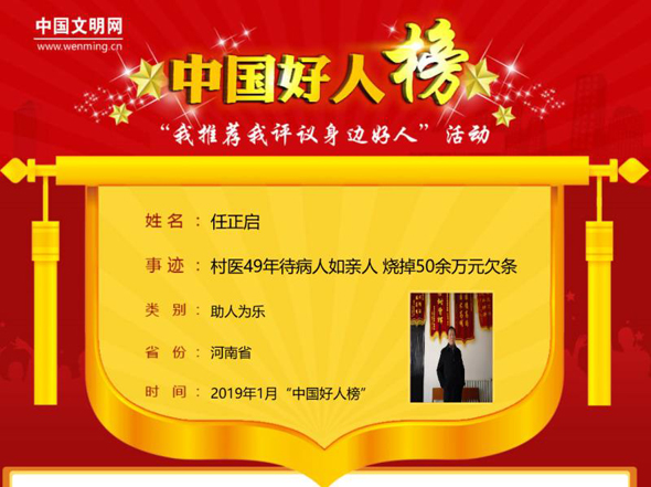 太康縣馬頭鎮(zhèn)任莊村村醫(yī)任正啟,待病人如親人,用腳步丈量任莊村周邊的每寸土地,他49年燒掉50余萬(wàn)元貧困戶(hù)看病欠條。2月25日,中國(guó)文明網(wǎng)發(fā)布消息:任正啟榮登2019年1月“助人為樂(lè)類(lèi)”“中國(guó)好人榜”。