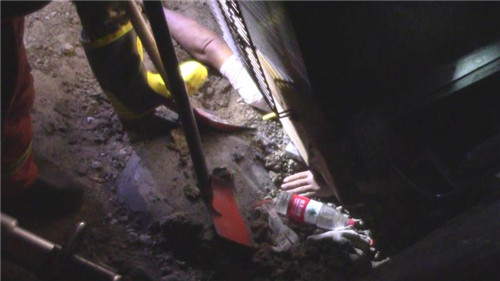 指揮員在與司機(jī)溝通時(shí)發(fā)現(xiàn),由于車身很重,司機(jī)手臂很快出現(xiàn)血液流通不暢、知覺微弱現(xiàn)象,如不及時(shí)脫困,后果十分嚴(yán)重。情況緊急,救援人員先利用剪擴(kuò)器對(duì)駕駛室與被困人員手臂處進(jìn)行擴(kuò)張,但由于車身較重,地面所墊硬物無法承受壓力,擴(kuò)張器無法發(fā)揮作用。隨后,救援人員利用鐵鍬在被困人員手臂下進(jìn)行挖土,5分鐘后,隨著空間的逐漸擴(kuò)大,被困人員手臂被小心翼翼抽回,司機(jī)成功脫困,消防指戰(zhàn)員從駕駛證另一側(cè)把他救出。