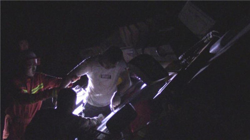 當(dāng)夜,消防指戰(zhàn)員接到調(diào)派命令后迅速趕往事故現(xiàn)場(chǎng)。指揮員觀察了解得知,側(cè)翻的是一輛重型推土車,由于作業(yè)區(qū)地面不平,司機(jī)在倒車時(shí)車輛發(fā)生側(cè)翻,欲打開車門跳車未果,左臂反而被車輛駕駛室一側(cè)死死壓在地面上,無法動(dòng)彈。當(dāng)時(shí)工地上沒有同事,周邊也沒有行人,呼救無應(yīng)后,司機(jī)忍著巨烈疼痛摸到手機(jī)電話求救。