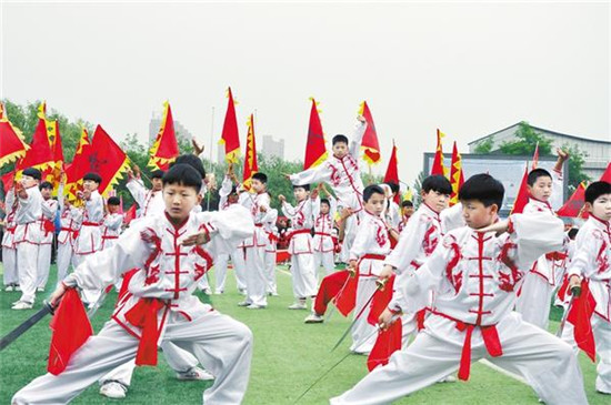 5月18日上午,為期一周的商水縣2019年“全民健身月”系列活動啟動。據悉,系列活動期間,該縣將舉辦“縣長杯”中學生足球賽、“萬步有約”職業(yè)人群健走、中小學生陽光體育運動會、周口市第四屆鞭陀交流賽等活動,全縣共有66支代表隊5000余人參與其中。圖為啟動儀式上的節(jié)目展演。記者 付永奇 攝