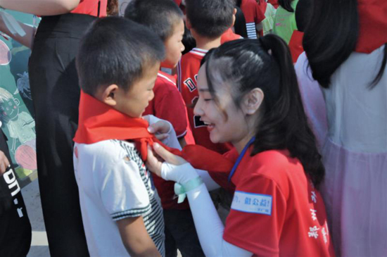 開班儀式上,鄭州升達經(jīng)貿(mào)管理學院的支教老師為同學們佩戴了紅領巾,伴隨著國歌進行了升國旗教育,支教老師進行集體宣誓。支教老師代表作表態(tài)發(fā)言時說:“很高興能夠來鹿邑周樓小學支教,作為一名當代青年大學生,我們能夠擔當重任,吃苦耐勞,全身心地完成兩周的支教活動,與孩子們快樂相處?!?/p>
