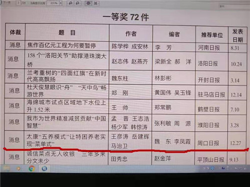 據(jù)介紹,本屆河南新聞獎(jiǎng)獲獎(jiǎng)作品具有“把握時(shí)代脈搏 謳歌時(shí)代精神”“反映重大主題 積極服務(wù)大局”“講述中國故事 彰顯主流價(jià)值”等特點(diǎn),主題深刻、事實(shí)準(zhǔn)確、文風(fēng)生動(dòng)、表現(xiàn)新穎,充分反映我省新聞戰(zhàn)線積極宣傳報(bào)道黨的十八大以來我省發(fā)展的歷史成就、歷史變革,報(bào)道我省各行各業(yè)改革開放的豐碩成果和感人事跡,特別是聚焦打贏精準(zhǔn)扶貧攻堅(jiān)戰(zhàn),形成宣傳的強(qiáng)大聲勢(shì)。作品堅(jiān)持正確的輿論導(dǎo)向、唱響主旋律、大力宣傳社會(huì)主義核心價(jià)值觀,為新時(shí)代中原更加出彩提供強(qiáng)有力的輿論支撐和良好的輿論氛圍?!短怠拔屦B(yǎng)模式”讓特困養(yǎng)老實(shí)現(xiàn)“菜單式”》具有“重大題材”“重大影響”“重大意義”等特點(diǎn),經(jīng)過專家層層評(píng)審,最終在眾多參評(píng)作品中脫穎而出,一舉奪得了河南新聞獎(jiǎng)一等獎(jiǎng)。