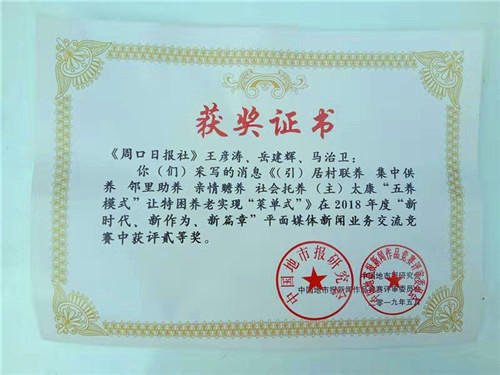 中國地市報(bào)新聞獎(jiǎng)評(píng)選活動(dòng)由中國地市報(bào)研究會(huì)主辦,每年舉辦一次,在全國有著廣泛的影響,此項(xiàng)新聞獎(jiǎng)評(píng)選活動(dòng)涉及全國幾乎所有地市黨報(bào),不僅是展示地市黨報(bào)形象的重要舞臺(tái),也是衡量地市黨報(bào)辦報(bào)水平的重要標(biāo)志,同時(shí)也是以新聞的形式展示各地亮點(diǎn)工作的重要?!短怠拔屦B(yǎng)模式”讓特困養(yǎng)老實(shí)現(xiàn)“菜單式”》稿件在此項(xiàng)新聞獎(jiǎng)評(píng)選中,同樣表現(xiàn)不凡,最終榮獲中國地市報(bào)新聞獎(jiǎng)二等獎(jiǎng)。