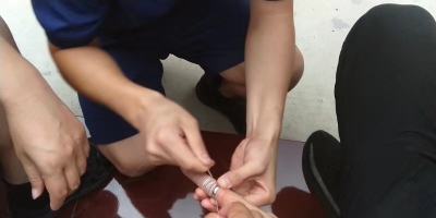 經(jīng)過查看,由于尺寸不合適,該男子左手中指已經(jīng)被戒指卡的出現(xiàn)充血,手指腫脹嚴重??紤]到用剪切器等器械剪戒指可能會傷到手指,指戰(zhàn)員利用纏線解線的方法,用細線穿過戒指在手指上纏繞,然后慢慢拉線,利用細線的滑潤效果幫助取下戒指,很快戒指被成功取下。