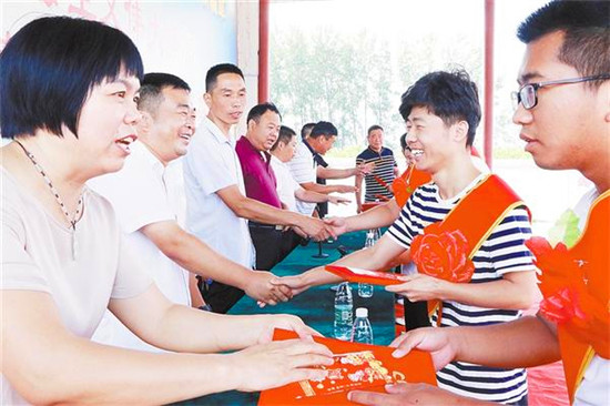 近日,市城鄉(xiāng)一體化示范區(qū)搬口辦事處曾樓行政村文化大院里,鑼鼓喧天,喜氣洋洋,熱鬧非凡。原來(lái)是村民在為該村大學(xué)新生舉辦歡送會(huì),同時(shí),該村黨支部還為這些大學(xué)新生發(fā)放了助學(xué)金。據(jù)了解,曾樓行政村有3000多人,2019年共有27人金榜題名,其中14人考入本科院校,13人考入??圃盒?。記者 張勁松 攝
