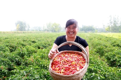 在朱樓行政村,朱高杰、王麗夫妻倆正帶領(lǐng)20多名采摘工人在辣椒田里采摘艷紅、泡椒兩個(gè)品種,地頭停放著盛滿辣椒的三輪車(chē)和五六個(gè)蛇皮袋,火紅的辣椒映襯著小兩口臉上燦爛的笑容:“大豐收呀,這塊地是泡椒,還沒(méi)有出地頭,就劃3.8元一斤了,走向市場(chǎng)至少五六元錢(qián)。咱吃的泡椒鳳爪、泡椒罐頭,都是這做的。像那塊地的艷紅,就像它的名字一樣又紅又鮮艷,出地頭就得七八塊,賣(mài)到市場(chǎng)上都10多元一斤,主要賣(mài)到四川、湖北等地,這是火鍋底料、炒菜的必備品,這是個(gè)炒出來(lái)有香味的辣椒品種?!蓖觖惸苷f(shuō)會(huì)道,而且在她的帶動(dòng)下,全鄉(xiāng)許多親朋好友都在種植辣椒。像王麗一樣,汲水鄉(xiāng)種植辣椒面積突破了1萬(wàn)畝,整個(gè)鄲城縣種植辣椒突破5萬(wàn)畝。