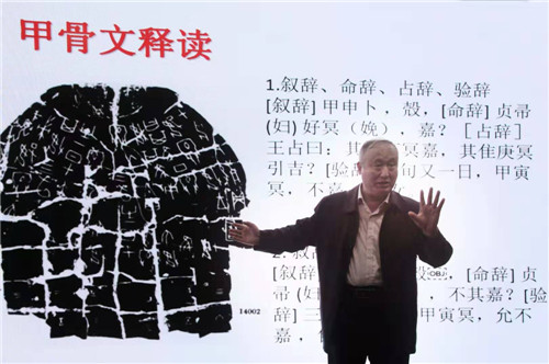 接著,在歷時(shí)兩個(gè)半小時(shí)的分享中,郝教授以融合發(fā)現(xiàn)、甲骨文字拆分、甲骨文書風(fēng)及甲骨文書法創(chuàng)作為立足點(diǎn),襯以個(gè)人習(xí)書作品,從文化本義的內(nèi)涵、文化本義的要素、文化的生成和甲骨文的演化和發(fā)展等方面詳細(xì)闡述了文化的來源以及人類社會進(jìn)步的過程。