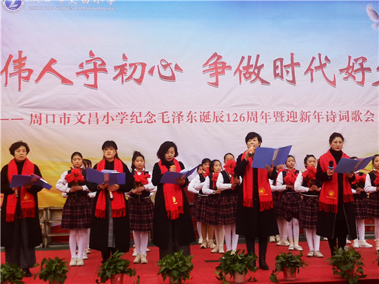 12月26日,是毛澤東誕辰126周年紀(jì)念日。為深切緬懷偉大領(lǐng)袖毛澤東,弘揚(yáng)革命精神、民族精神和愛國主義精神,文昌小學(xué)舉行了紀(jì)念毛澤東誕辰126周年暨迎新年詩詞歌會。