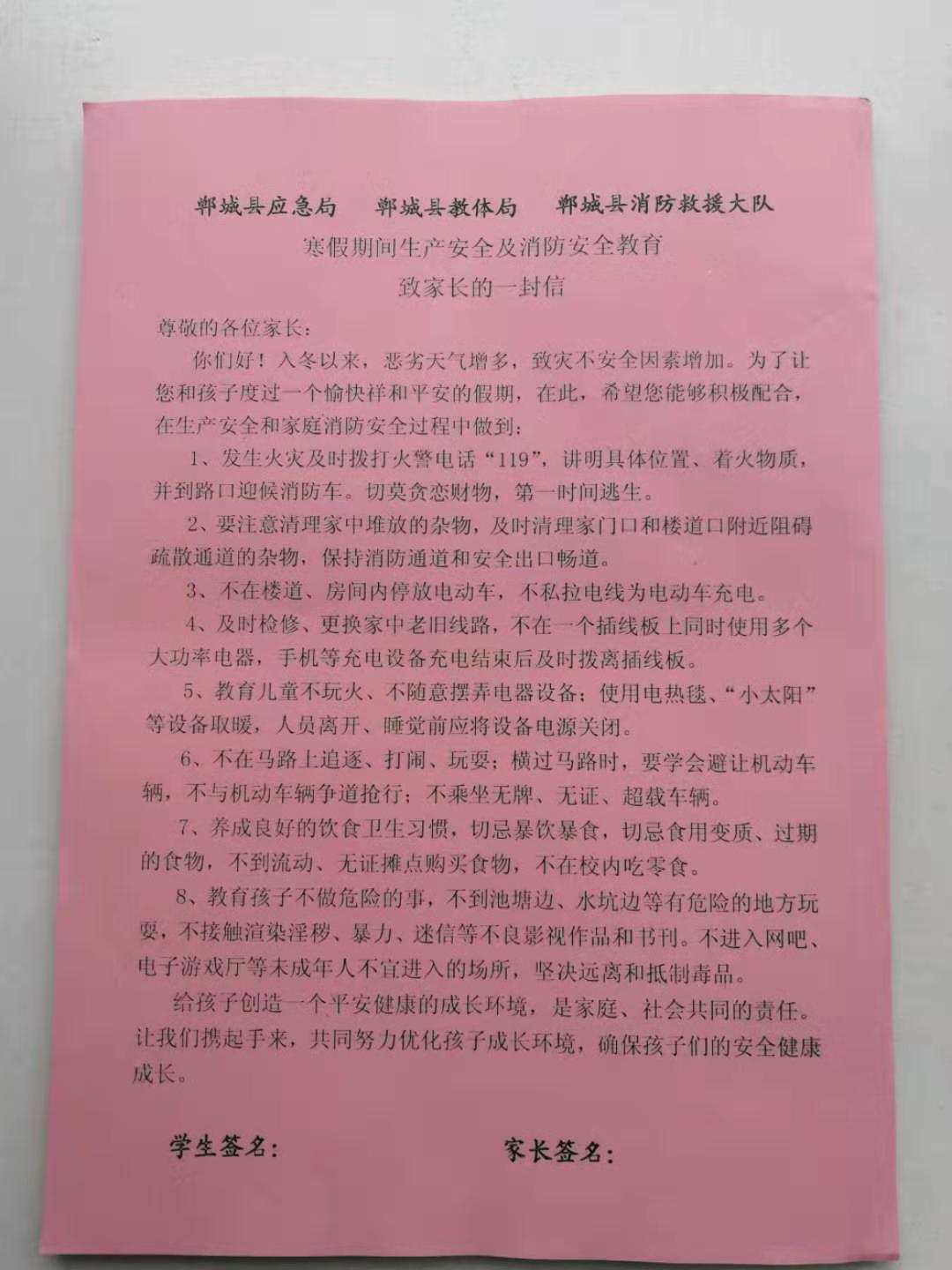 《寒假期間生產(chǎn)安全和消防安全教育致家長的一封信》包括正確報119火警、電動車充電、電熱毯使用、保持疏散通道暢通等消防安全知識以及交通安全、食品安全、網(wǎng)絡(luò)安全等,內(nèi)容豐富,有很強的針對性。鄲城縣委常委、常務(wù)副縣長王智華高度重視《一封信》的印制發(fā)放工作,專門召開會議要求縣應(yīng)急局、縣教體局、縣消防救援大隊各司其職、密切配合,縣消防救援大隊牽頭,挑選貼近生活、身邊常見的安全及消防常識,以簡潔實用、通俗易懂的語言,印制《一封信》內(nèi)容;縣教體局要迅速部署,確保在放假之前,把《一封信》發(fā)放到每名學(xué)生手中。為確保取得實效,縣教體局、縣消防救援大隊還聯(lián)合發(fā)文,要求《一封信》必須由家長和學(xué)生共同完成學(xué)習(xí),學(xué)習(xí)完畢后家長和學(xué)生還要共同簽名確認,假期結(jié)束后由學(xué)校統(tǒng)一收回報教體局存檔。