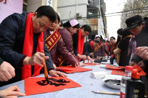 18日上午9時30分,位于新建街的周口儷嬰婦女兒童醫(yī)院門前喜氣洋洋,張燈結彩,熱鬧非凡,儷嬰婦女兒童醫(yī)院邀請市書協(xié)、川匯區(qū)書協(xié)的書法家們,在門前為“送福送健康暨書法家義寫春聯(lián)”活動舉行了簡短的儀式,隨即活動展開,一邊是儷嬰婦女兒童醫(yī)院的專家們將坐診臺搬到門前,細致地為來往的居民免費量血壓、把脈等義診,一邊擺下10多張桌子和筆墨紙硯,中國書協(xié)會員游保峰,著名書法家、川匯區(qū)書協(xié)終身名譽主席李大慶,書法家馮干敏、李輝、李國斌及川匯區(qū)書協(xié)主席李尊杰,市書協(xié)副主席劉廣巖,川匯區(qū)書協(xié)副主席兼秘書長杜忠義,副主席曾祥峰、何楠,著名書法家寇成義等書法家們,展開大紅的紙張,揮毫潑墨,飄著墨香的福字和一對對大紅的春聯(lián),帶著新春的祝福,送到居民手里,一波波居民到自己喜愛的書法家面前,喜討福字和春聯(lián),開心的喜悅洋溢著臉上……